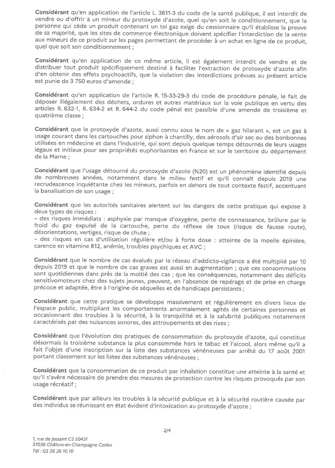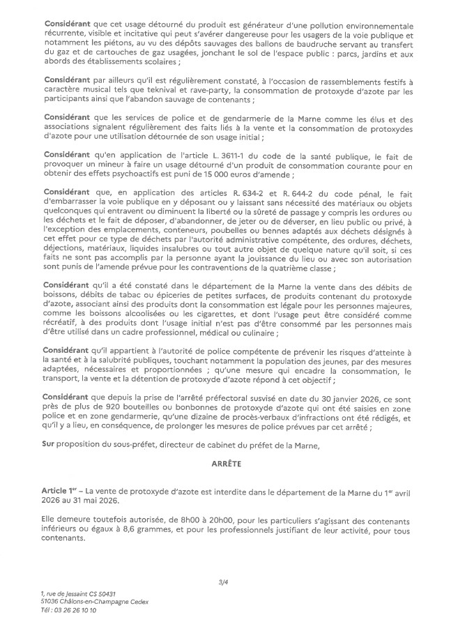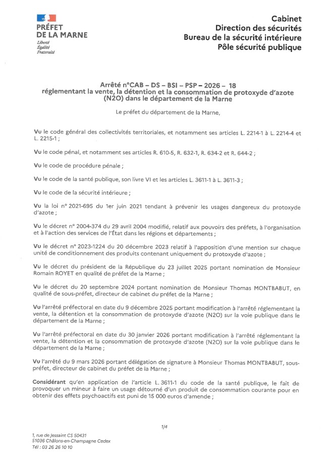 Arrêté préfectoral réglementant la vente, la détention et la consommation de protoxyde d’azote (N2O) dans le département de la Marne